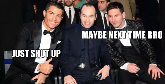 Ronaldo confie ainsi ne pas être frustré de ce classement et admet que Messi est meilleur joueur que lui tout en soulignant bien qu’il continuera à faire de son mieux pour l’année à venir. Quant à Iniesta, son coéquipier sur le terrain, Messi « ne laissera pas s’échapper un cinquième Ballon d’Or de suite ». Ça a l’avantage d’être clair : tout le monde reconnait la supériorité de Messi et c’est plutôt beau à voir.
