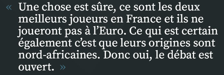 « Deschamps, il a un nom très français et personne dans sa famille ne s’est mélangé avec quelqu’un d’étranger. Comme les Mormonts aux États-Unis [..] Benzema et Ben Arfa sont français, ont des origines et ne seront pas à l’Euro. Je suis autorisé à m’interroger sur ça ». Pas étonnant que Deschamps ait porté plainte -_-‘ Et autant dire qu’à deux semaines de l’Euro, l’Équipe de France n’avait pas besoin d’une énième polémique après le cas Benzema. D’autant plus qu’on joue la coupe à domicile… À croire que les dramas sont partie intégrante du football français…