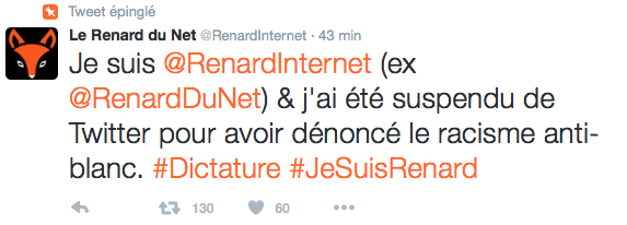 Sans doute la polémique du jour chez l’oiseau bleu. Si j’ai bien compris, le compte Twitter du « Renard du Net » fait en sorte de cibler et dénoncer tous les tweets haineux à l’égard de la France ainsi que les tweets racistes envers les blancs. Un dévouement que certains twittos assimilent à du harcèlement et qui les aurait poussé à signaler en masse le compte du Renard. Résultat : celui-ci s’est fait suspendre pour « avoir été crée à des fins perturbatrices » selon l’intéressé. Seulement voilà, le Renard étant quelque peu famous sur le réseau, le hashtag #JeSuisRenard s’est rapidement propulsé dans le Top Tweets avec une vague de soutiens en faveur du dénonciateur anonyme.