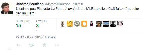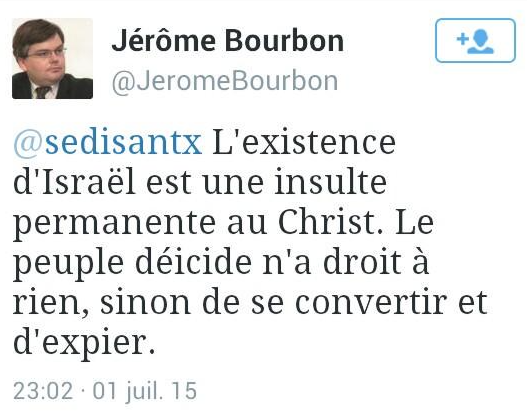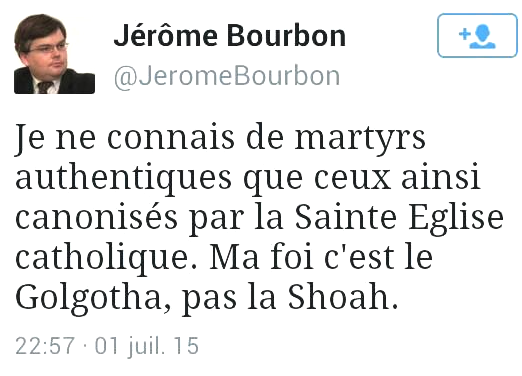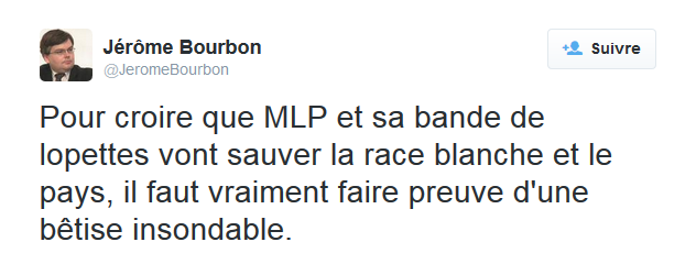 Je ne connaissais pas ce Jérôme Bourbon avant cette affaire…et je ne le regrette pas. Car il faut savoir que Jérôme Bourbon est, accrochez-vous, foncièrement antisémite, homophobe, un brin nazi et voue une haine sans bornes à Marine Le Pen qui n’a d’égal que son admiration pour Jean Marie Le Pen. Et c’est donc ce bonhomme, directeur du journal « Néo Nazi et Anti Néo-FN » Rivarol, qui s’est fait gifler + filmer il y a quelques jours de ça.