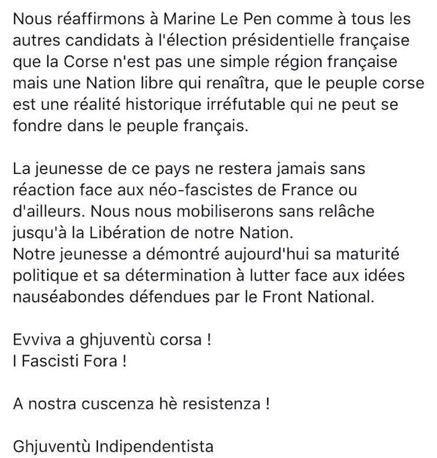 Des militants indépendantistes corses. Mais revenons quelques instants en arrière —> En plein milieu d’après-midi, et alors que Marine Le Pen s’apprête à faire un discours dans le Palais des Congrès d’Ajaccio, une quinzaine de manifestants déboule dans la salle. L’objectif est clair —> Revendiquer l’indépendance de la Corse là où la candidate du FN appelle à un maintien de l’Île de Beauté sous le giron français. S’ensuivent des bagarres et une expulsion manu militari des indépendantistes par les services d’ordre du FN et du Palais des Congrès. La salle dans laquelle devait avoir lieu l’évènement a été évacuée suite au lancement de gaz fumigènes par les forces de sécurité. Le meeting a pu avoir lieu dans une salle annexe.