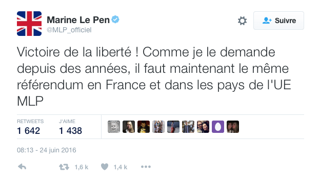 Celle-ci a d’ores et déjà appelé à la mise en place d’un tel dispositif suite à la victoire du « Oui » au RU. Quant à Alain Juppé, c’est tout le contraire. Convaincu que l’Europe doit tirer de puissantes leçons de ce cataclysme et attribuer plus de souveraineté aux pays membres dans des domaines clé (immigration, économie, justice), celui-ci considère que mettre en place un référendum serait « une victoire sur un plateau pour Madame Le Pen ». Autrement-dit, s’il arrive au pouvoir, nous n’aurons pas de Frexit. Lequel aurait potentiellement des effets désastreux sur notre économie vu que nous sommes déjà bien endettés -_-‘ Ha, si seulement l’UE avait été pilotée par des esprits compétents oeuvrant (vraiment) pour le bien commun, nous n’en serions pas là aujourd’hui.