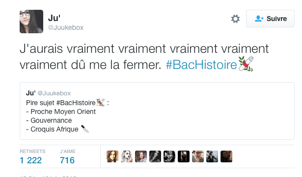 Résultat —> 15/20 (⌐■_■) Ça m’a rappelé à quel point j’avais une mémoire de FOLIE au collège/lycée ! J’étais capable d’apprendre par coeur des pages et des pages…puis tout s’est arrêté lorsque je suis entré en fac xD Incapable de mémoriser ne serait-ce qu’une page… Du coup, j’ai dû réfléchir par moi-même…et avoir recours aux antisèches pour toutes les dates importantes \^o^/ Oui, j’étais un thug ! Un thug qui a réussi à aller jusqu’au au Bac +5 mwahaha ლ(╹o╹ლ) Quand bien même j’aurais dû faire Youtubeur à bien y repenser <_<