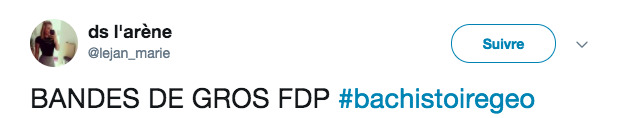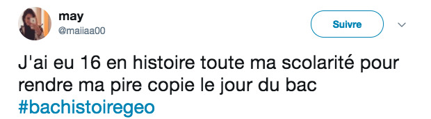 Ahahah. En même temps, arrêtez de faire des pronostics sur le Bac !! Comme quoi cette année, ce serait majeure Géo et explication de documents en Histoire… Pourquoi ? Parce qu’en 2016, c’était Majeure Histoire et réalisation de croquis en Géo !! Sauf que non ! Parfois, il arrive qu’on tombe deux années de suite Majeure Histoire ._. Comme aujourd’hui par exemple… Peut-être que l’année prochaine, il y aura encore une Majeure Histoire ! À mon époque, il y a 88 ans, on faisait en sorte de se préparer à tout ! Parer à l’imprévisible, telle était notre devis (-‸ლ) Je vois que les 99 ont perdu cette habitude de survie .-. Résultat —> 95% des bacheliers L et ES (les S ont apparemment échappé au massacre) pleurent leur vie ! Pour s’être fait leurrer par le destin. D’ores et déjà, leur esprit se conditionne à passer aux rattrapages ._. Triste.