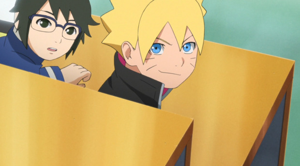 Ha, Boruto… Le premier jour et il oublie déjà son cahier -_- En cela, il ressemble pas mal à son père ._. Même s’il faut reconnaitre que Boruto semble beaucoup moins impulsif et nerveux ! Merci Maman Hinata ^o^ Mais pour revenir sur Naruto, il est frappant de constater à quel point celui-ci est devenu hyper cool parmi la nouvelle génération ! Alors qu’il était considéré comme un looser à l’époque de l’académie… Ça aide de sauver le village et le monde ^^ Anyway ! Inojin n’a pas l’air d’apprécier Boruto xD Et, comme son père, il dit tout ce qui lui passe par la tête ! Autrement, est-ce que je suis le seul à qui ça fait bizarre de voir Shino en professeur ?! Puis qui est ce Yuino Iwabe ? -_- Le Sasuke de la classe mais en mode « cancre » —> Celui-ci ayant déjà redoublé deux fois du fait que le ninjutsu/taijutsu, dans lequel il excelle, ne suffit plus pour passer ! Espérons que sa joute avec Boruto lui ait servi de leçon !! J’ai l’impression que nous allons avoir beaucoup d’épisodes calmes…