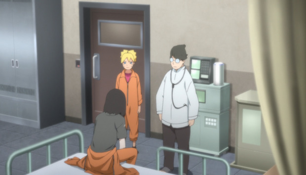 « Puisque je vous dit qu’on m’a attaqué !!! » s’exclame Kokuri. « Je comprends mais juste une éraflure ? » s’interroge le médecin, perplexe. « Et vous n’avez pas vu votre assaillant ? » ajoute Boruto. « Ça a été soudain ! Je n’ai vu qu’un uniforme de prisonnier ». « C’est encore plus invraisemblable… » soupire le doc. « Impossible d’entrer dans l’infirmerie sans ce tag en bois ». « T’es encore là, toi ?! » réalise l’un des gardes à l’attention de Boruto. « Viens ici !!! ». « Je jure que je vous protégerai, Kokuri-san ! » dit le jeune homme avant d’être embarqué dans sa cellule. […] « Alors, c’était comment ? » demandent Arai et Kamata. « Le paradis, ahah ! » répond Boruto. « T’as fait de beaux rêves ? » s’interroge Mitsuki. « Oui mais ça a fini par virer au cauchemar ». « Les rêves ne valent rien, de toute façon ! » réplique Kamata. Sur ce, il est temps d’établir un plan pour secourir Kokuri. S’il n’est même pas en sécurité dans le bloc médical, qui sait ce qu’il risque en dehors de celui-ci.