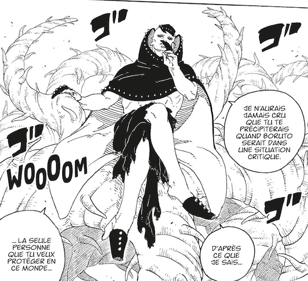 Très bon chapitre avec un Kawaki bien plus puissant et qui, pourtant, peine à contenir Jura. Il faut dire que nous avons probablement affaire à l’incarnation de Juubi même. En témoignent toutes ces racines mokuton caractéristiques du démon à dix queues. Bien sûr, sa puissance est manifeste au point de pouvoir détruire l’un des cubes issus de la dimension de Kawaki. Pour autant, ce qui en fait une menace absolue est sa capacité à pouvoir apprendre, raisonner et prendre des décisions de son propre chef. Au point d’être captivé par tout ce qui relève de la philosophie mais aussi de l’humanité à travers l’empathie et le concept de l’amour. Son obsession à vouloir assimiler ses rêves en les dévorant le rend de facto très dangereux. Quand bien même son sourire face au compliment de Kawaki reste intriguant. Au passage, même une tête brulée comme lui a compris qu’un tel ennemi était invincible de plein front. Voilà pourquoi il est probable qu’un sceau de Jura soit à la carte dans l’esprit de Boruto. Reste à savoir comment cela se fera.