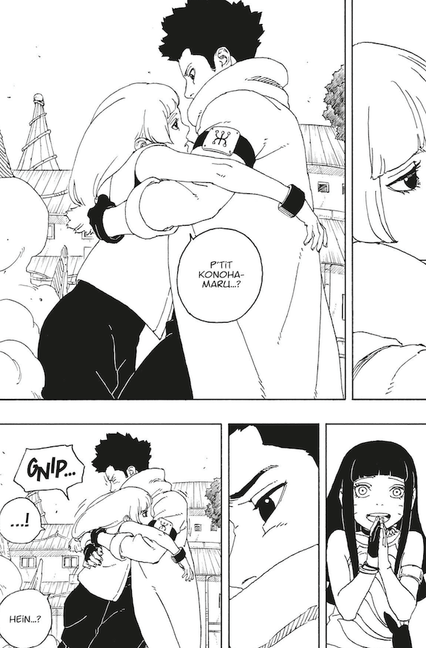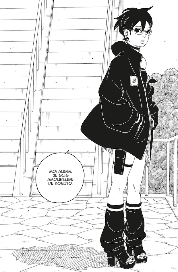 « Disons que tu es plus proche de moi ou de Jura ». Par ces mots, Kyubi semble se référer au style de combat de Himawari. Est-ce que cela a un lien avec le byakugan qui permet de voir les tenketsu (points à travers lesquels circule le chakra dans un corps) et de les manipuler à travers le Juken (poing souple) ? Probablement. Peut-être allons-nous assister à une incarnation du chakra capable de contrôler avec finesse les méridiens de l’adversaire tout en s’assurant la puissance brute d’un bijuu (et pas n’importe lequel). Hâte de voir ça ! Et comme si cela ne suffisait pas, nous voilà gratifié(e)s des véritables sentiments de Sarada à l’encontre de Boruto ! Sumire sait désormais qu’elle peut se battre avec son amie en toute légitimité. Quant à Momoshiki, il était temps qu’on le revoit ! Son aura n’a clairement pas disparu. Quand bien même sa volonté de vivre n’est plus maintenant qu’il a réalisé combien l’esprit de Boruto était résilient. Mais notre héros a t-il vraiment l’intention de lui céder son corps s’il parvient à vaincre Jura ? J’en connais une qui risque de ne pas le laisser faire.