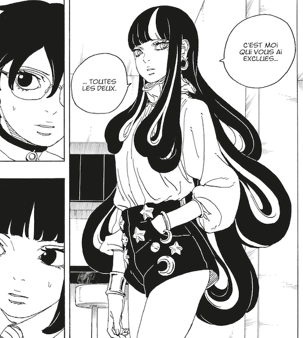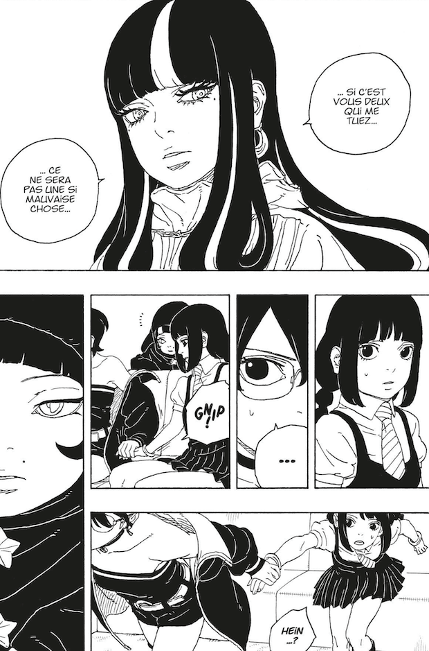 Rappelons que l’objectif de Mamushi est de dévorer Eida. Ce qui laisse craindre un scénario néfaste pour l’un des personnages que j’apprécie le plus dans Boruto. Le fait qu’elle soit de facto devenue amie avec Sarada et Sumire en plus de leur faire part de son désir de mourir de leur main s’il fallait éviter le pire s’apparente à un indice lugubre. À voir ce qu’il en sera mais une chose est sûre, il va falloir que Daemon, Boruto, Himawari, Eida, Sarada mais aussi Inojin se surpassent. Oui, le fils de Sai et Ino pourrait avoir un rôle clé s’il parvient, comme le souhaite Kashin Koji, à mettre au point une technique « hautement compatible avec la transmission mentale ». Lui-aussi doit tout donner pour éviter le pire. À savoir la mort de Himawari. Hâte de voir tout ça ! Quand bien même j’appréhende la dramaturgie à venir (qui reste nécessaire pour ce type d’oeuvre).