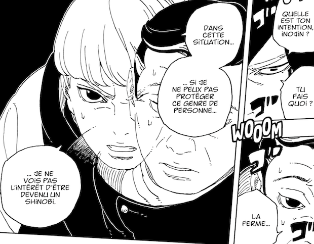 Un chapitre fort bien rythmé avec une multiplication des enjeux qui commencent à partir dans tous les sens. Avec une Eida épiée constamment. Mais commençons par ce cher Kobu, entremetteur du seigneur du feu, Ikkyu Madoka, que Kashin Koji aurait tout bonnement souhaité voir disparaitre. Car trop dangereux pour la « bonne continuité des choses ». Rappelons que son Jippo des Dix Directions lui permet de voir une vérité de futurs possibles. À lui, ensuite, d’oeuvrer pour le meilleur avenir qui soit. Ici, éliminer Kobu était la meilleure option mais, pour des shinobi de Konoha tels que Inojin, il était hors de question de l’exécuter ainsi. J’imagine que Kashin en avait conscience et que l’intervention de Boruto sous les yeux de Kobu représente un « bon plan B ». Il n’empêche que la place de Shikamaru est sur la sellette, désormais. Une autre inquiétude que relève le chapitre est la capacité de Sarada à pouvoir déployer son mangekyou sharingan comme bon lui semble. Nous le savions déjà mais, fichtre, que la vision se détériore rapidement lorsque cette arcane est déployée !