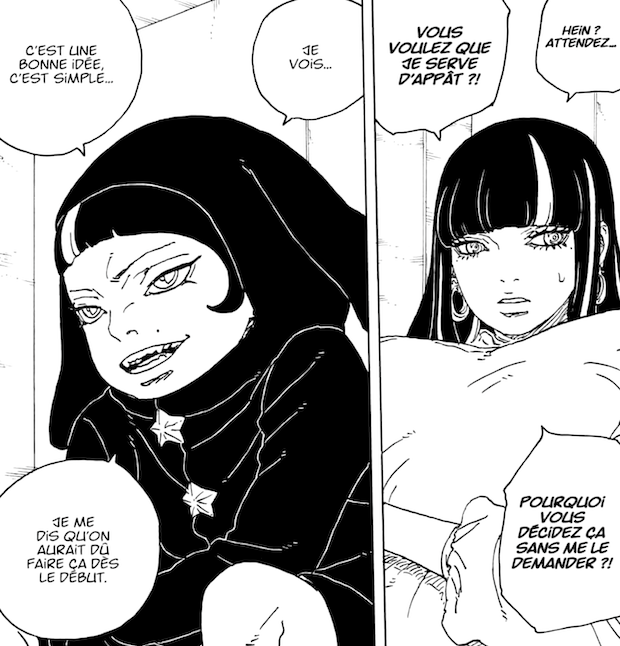 La seule solution dont on ait connaissance pour pérenniser la vision est d’assimiler les yeux d’un autre Uchiha. Et, mis à part Sasuke, il n’y a plus personne de vivant parmi ce clan. Damn. Quoiqu’il en soit, ça fait plaisir de voir Delta à l’action. Il va sans dire qu’elle aura un rôle important à jouer par la suite vu son lien avec Amado. Rappelons que ce dernier souhaite ressusciter sa fille, Akebi, grâce à l’un des pouvoirs Otsutsuki que pourrait receler Kawaki en lui. Pour conclure, impossible de ne pas s’inquiéter pour Eida qui, dès lors qu’elle activera son senrigan, sera détectée par Mamushi. Et ce sera le moment pour Daemon pour nous montrer s’il est toujours le protagoniste le plus puissant du manga hors Jura. Quelque chose me dit que Mamushi a une capacité pouvant causer problème au petit frère de Eida. J’espère vraiment qu’on n’aura pas de mort pour ces deux-là et en particulier Eida que j’ai appris à apprécier. Vite, la suite !