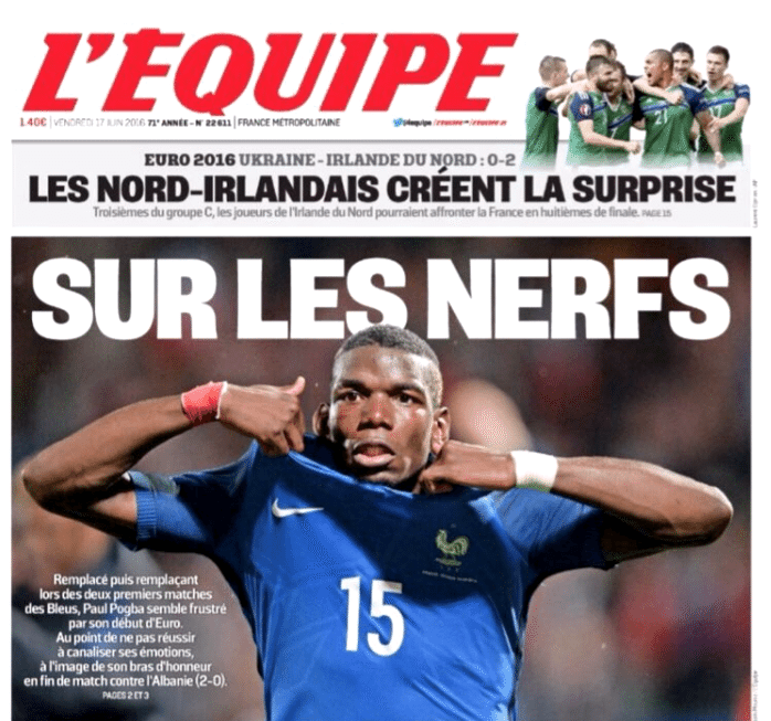 Alors qu’on devrait être tous uni derrière les bleus, voilà qu’on perd notre temps à s’éparpiller sur ce genre de faux sujet. Tout commence mercredi soir lorsque Paul Pogba, après une passe décisive à Dimitri Payer et ce deuxième but contre l’Albanie, adresse un semblant de bras d’honneur en direction de la tribune de presse. Et là, c’est le drame, la presse s’empare de la polémique jusqu’à y dédier leur une. Or, autant c’était justifié pour l’affaire Benzema, autrement plus sérieuse, autant là, je trouve cette histoire ridicule.