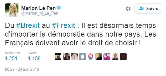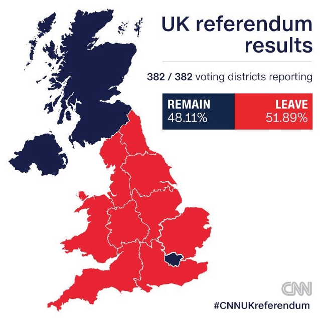 Boom. Je ne m’attendais pas à ce que le Royaume-Uni sorte vraiment de l’Union Européenne suite à ce référendum…et j’avais tort ! Avec un score de près de 52% (sur plus de 33 millions de votants), la victoire du « Oui » au Brexit est incontestable. Dire que les bookmakers avaient prévu une victoire du « Non » à 90% en utilisant toute une tripotée d’algorithmes et autres outils statistiques de dernier cri -_-‘ Bravo les mecs, vous êtes des champions ! Reste à voir quelles vont être les conséquences d’une telle décision sur les UK ainsi que sur l’UE.