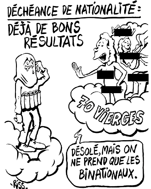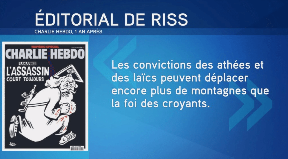 Et c’est cette double pensée qui a fait que le « Je suis Charlie » a été aussi décrié il y a un an. Certains internautes ne comprenant pas qu’on puisse soutenir la liberté d’expression tout en étant pas fan (loin de là) de la ligne éditoriale du journal satyrique. Le premier numéro de 2016 ne devrait pas faire exception à la règle : oui, la liberté de ton est essentielle (et si ça va trop loin, à la justice de s’en occuper, pas à une bande de fanatiques dégénérés) mais cela n’empêchera pas la critique. Ainsi, je ne suis pas persuadé que fustiger les croyants et leur manque de clairvoyance d’un coté pour ensuite adouber les laïcs/athés soit une bonne idée. Pourquoi ne pas s’en prendre aux fondamentalistes et fanatiques de tout bord ? Ceux-là même qui tuent au nom de leurs idées malades ? Enfin bref…
