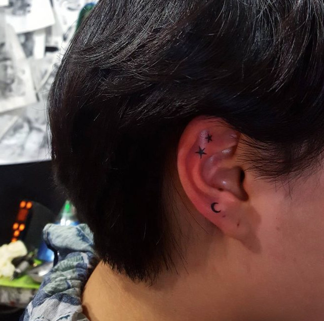 On appelle ça le Gwimunsin \^o^/ Soit le fait d’arborer un tatouage sur ou à coté de l’oreille ! Cela dans un double objectif —> D’une, parce que c’est esthétique. De deux, parce que être tatoué en Corée du Sud et plus généralement en Asie est plutôt mal vu -_- Voire interdit comme c’est peu ou prou le cas au Pays du Matin Calme (c’est beau ce surnom) ! Au Japon, il n’est pas rare de se voir refuser l’entrée d’un onsen (bain thermal) si le tenancier s’aperçoit que vous êtes tatoué <_< Ou alors on vous demandera de le cacher moyennant une sorte de tuile en plastique à appliquer sur la zone illicite xD Space ! Après m’être renseigné, j’ai cru comprendre que le tatouage était perçu par certains Asiatiques comme un signe nocif vis-à-vis de l’intégrité du corps humain. En se tatouant, on se dénature et ça, c’est pas bien >o< Qu’importe que le tatouage en question soit sublime —> Là n’est pas la question !