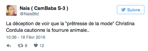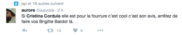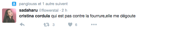 Affligeant de bêtise. Pourtant, j’ai appris à prendre beaucoup de distance avec les défenseurs de la fourrure car ils sont nombreux. Le nombre d’amis et de connaissances que j’ai et qui portent une fourrure en renard ou faite de poils de lapin sans le moindre état d’âme ._. Mais de là à le revendiquer publiquement alors qu’on fait tout pour sensibiliser les consciences du fait que dépecer vivant un animal, ce n’est pas très bien… Non, quoi. D’autant plus si c’est pour faire une distinction débile entre animaux d’élevage (soit destinés au dépeçage) et les autres. Nous avons encore un long chemin à faire.
