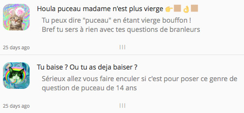 « Pourquoi t’es pas encore morte ? », « Est-ce que tu peux mourir s’il te plait ? », « T’es beaucoup trop moche pour rester en vie ». Et Rebecca n’est pas la seule victime. Il y en a eu d’autres. Notamment au Royaume-Uni. Afin de contrer ce type de propos, Curious Cat propose à ses utilisateurs d’activer un filtre permettant aux modérateurs de supprimer ou non les messages insultants. Problème —> Une telle modération implique un délai d’attente de plusieurs heures. Quant à cette rumeur de levée d’anonymat, je suppose qu’il s’agit d’une fake news inventée sur Twitter. Mais voilà ! C’était l’occasion de parler de cette application assez réputée parmi les adolescents. Une application qui n’est pas sans risques. Soyez vigilants.