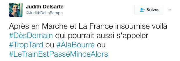 Or, depuis la fin des présidentielles, beaucoup de politiques réalisent à quel point ces deux mouvements ont engendré un soutien à la fois massif et porteur en termes de présence sur l’échiquier politique. La France Insoumise de Mélenchon, d’inspiration éco-sociale, humaniste, anti-libérale et alter-mondialiste est le premier mouvement/parti des jeunes de 18-24 ans et pourrait faire un tabac aux législatives de juin prochain. En Marche de Macron, d’inspiration social-libérale, progressiste, europhile et transformiste, a permis à l’intéressé d’entrer à l’Élysée. Clairement —> Les mouvements, citoyens et participatifs par essence, semblent avoir amorcé un renouveau qui, peut-être, réconciliera à terme les Français avec la politique. Mais voilà, là où les mouvements de Macron et JLM semblent avoir été impulsés avec un certain degré d’authenticité, ceux de Hamon et Aubry/Taubira/Hidalgo portent à confusion. D’autant plus que la clique n’entend pas quitter le PS pour autant !! De quoi donner l’impression d’un renouveau en demi-teinte. Plombé par une volonté égoïste de conserver ses privilèges dans un parti pourtant sclérosé et condamné. Puis ce nom, « Dès Demain » -_-‘ Ha la la !