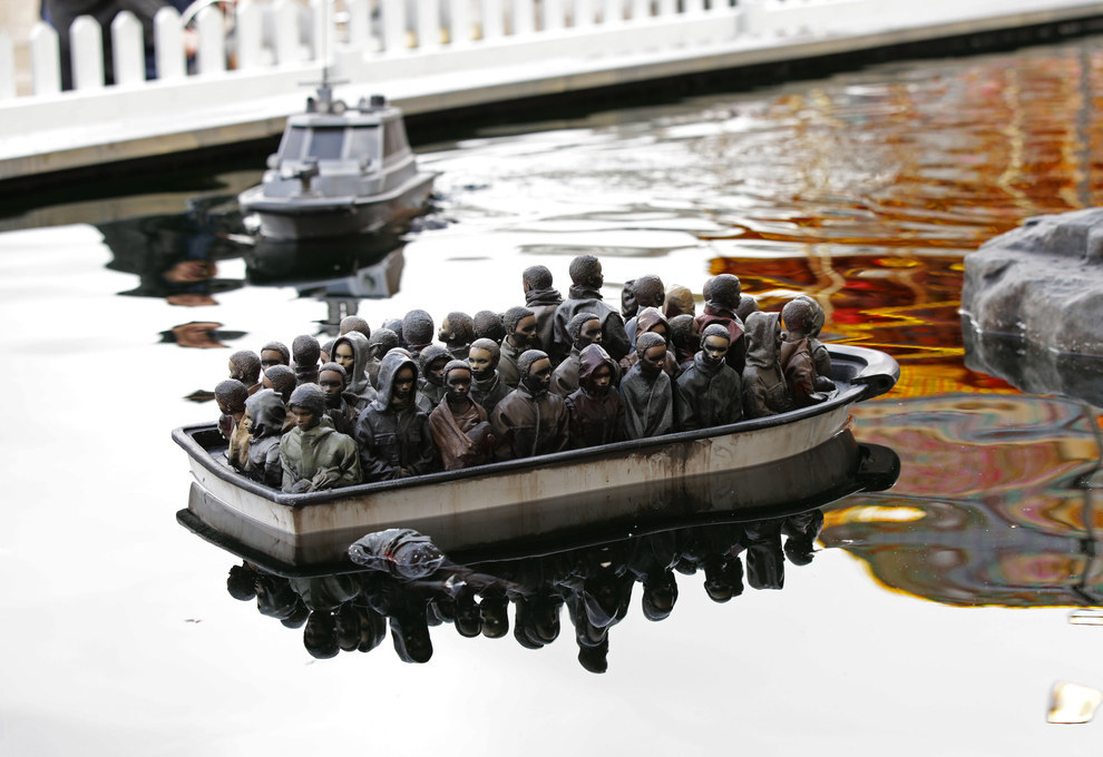 D’autant plus que pas mal d’éléments du réel, tels que ces bateaux de migrants voguant et s’écrasant dans les eaux huilés d’une fontaine en panne, se sont invités à la partie. Il faut en effet comprendre que derrière cette image sombre et glauque de Disney se cache une critique drastique de l’entreprise et de son business model centré autour de la rentabilité optimale et déshumanisée du genre humain. « Nous vous vendons du rêve et nous vous le vendons au prix fort » u_u Pour celles et ceux qui seraient intéressés par une petite visite au « Pays des Merveilles », l’attraction Dismaland se trouve à Weston (UK) en pleine banlieue de Bristol. Enjoy :3