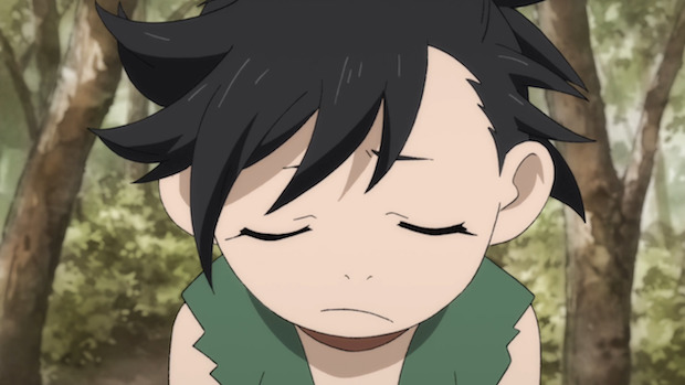 Dororo en a marre de marcher ! « Ce passant nous a roulé dans la farine… » se plaint-elle. « On aurait dû arriver une fois l’encolure de la montagne franchie et nous voilà à errer sans but ». Mais Hyakkimaru ne l’écoute pas. Affairé à poser sa tête sur un cheval. « Il faut qu’on retrouve le faiseur d’épée » dit-il. Vu que le père de coeur de Hyakkimaru, Dr. Jukai, ne veut plus aider son fils, celui-ci ira voir ailleurs. « Munetsuna ? » leur répond un villageois. « Il vit à l’orée du village ! Mais j’espère que vous n’allez pas lui demander de forger une épée ». Oops. « Bah… » s’étonne Dororo. « C’est un forgeron réputé, non ? » . « Nope ! ». « Pourtant, l’autre camelot nous a dit qu’il était l’un des meilleurs artisans du Japon ». « Il m’a forgé cette hachette… » explique le jeune homme. « Et c’est nul ! Qui plus est, sa fille, Okowa, est moche ! Et elle a un mauvais caractère ! ». Hm. Ce garçon est bizarre. « Il vaut mieux que je m’en assure par moi-même » se dit Dororo en essayant la hachette. « Quelle tranchant… Grand frère, cessons de perdre notre temps ici ! ».