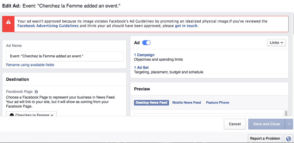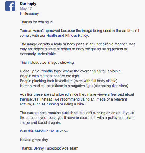Seulement voilà, selon Facebook, faire la promotion d’une telle photo risque de renvoyer une « mauvaise image » chez les internautes concernés par des problèmes de peau. « Au lieu de promouvoir des femmes en petite tenue « dont l’excès de graisse est visible », l’équipe publicitaire recommande des images plus « saines » promouvant par exemple une activité sportive telle que le fait de « courir ou conduire un vélo ». Ou comment formaliser un peu plus la beauté féminine à une femme mince et sportive. Les rondes ? Celles-ci devraient sérieusement envisager d’entamer une diète si elles souhaitent être un minimum désirables ! Heureusement, face à la polémique suscitée, Facebook s’est excusé en indiquant ne pas avoir fait suffisamment preuve de « clarté d’esprit » sur cette photo en question u_u