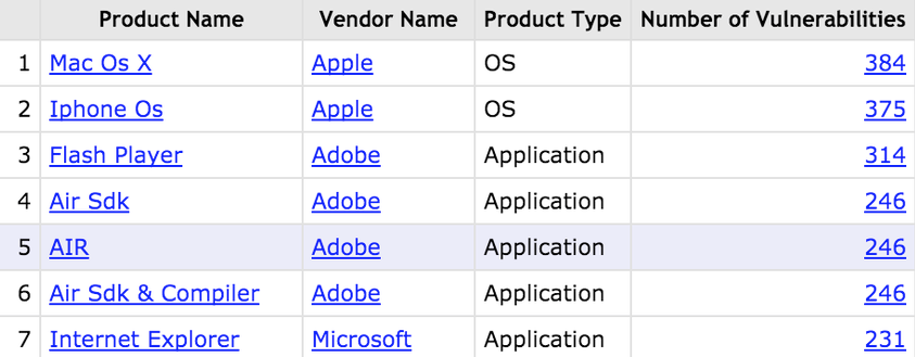 L’année commence mal pour la Team Apple (•︵•) Pourtant, les failles sécuritaires et tout le tintouin devraient être l’apanage des systèmes Windows…plus maintenant, on dirait bien <_< En témoigne ce classement réalisé par l’institut CVE et qui répertorie les pires systèmes d’exploitation en termes de sécurité/fiabilité. Résultat : les deux premières places sont trustées par l’OS des Macs d’Apple, OS X, suivi par l’OS des iPhones, iOS. C’est beau, tout ça ._.