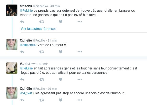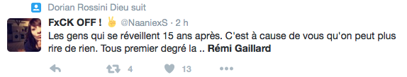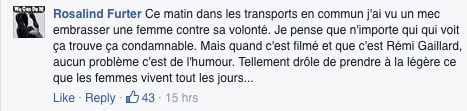 Depuis ? Il continue encore et encore. Peut-être parce qu’aucune des femmes victimes de ses caméras cachées n’a osé porté plainte. Peut-être parce que la justice ne s’est jamais vraiment intéressée à son cas. Peut-être parce que Rémi Gaillard continue à être l’un des Youtubeurs les plus populaires en France et dans le monde. Se faisant, il doit se croire immunisé et persiste à agresser sexuellement des femmes sous le prétexte du « Ho ça va ! C’est pour rire ! ». Ou comment banaliser le harcèlement sexuel et participer à la culture du viol et au mythe de la femme objet. Bien joué Rémi ! T’as 41 piges et tu n’as toujours rien compris.