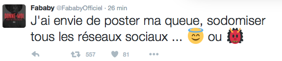 Devoir écrire une news comme ça dès le lundi matin, c’est complexe. Surtout lorsqu’il est question d’un rappeur que je ne connais pas et qui s’amuse à poster des snaps de lui à poil histoire de faire la promo de son nouvel album « Ange ou Démon ». Sauf que voilà, il s’agissait d’une très mauvaise idée et depuis hier soir, les railleries et montages affluent sur la twittosphère. J’ai d’ailleurs cru comprendre que ce n’était pas la première fois que Fababy (ce blase…) s’amusait à poster des photos de son engin sur Internet.