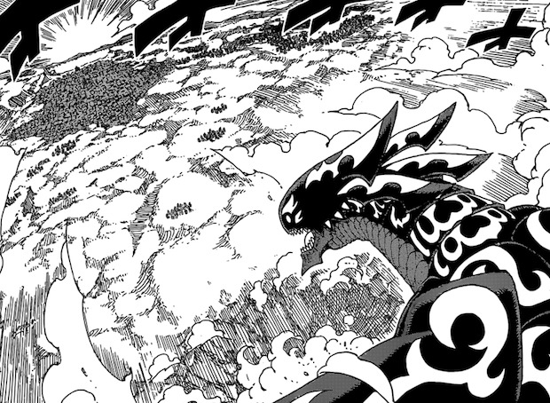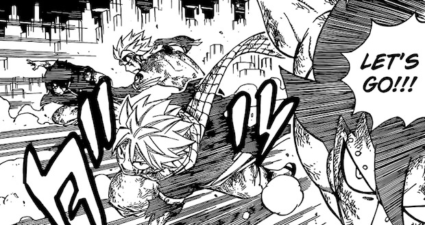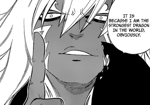Ça serait sympa que le rythme s’accélère un peu ! Je rappelle qu’il ne reste plus que 5 chapitres… Et le combat entre nos Dragon Slayers VS Acnologia Humain vient à peine de commencer ! Quant à la forme dragon de Acnologia, celui-ci se contente de détruire TOUT sauf des êtres vivants xD Histoire que Lucy puisse tranquillement penser au futur cheat code qui va leur permettre de survivre —> Fairy Sphere ! Bon ! Pour être équitable, ce sort avait déjà été lancé par Mavis à la fin de l’arc Grimoire Heart ! Ce n’est donc pas une surprise totale de le voir réapparaitre ici… Ma prédiction —> Fairy Sphere va emprisonner le Roi Dragon suffisamment longtemps pour que la Team Natsu parvienne à vaincre Acnologia ! Et vu qu’il s’agit de Fairy Tail, je suis sûr d’avoir raison ( ▔∀▔ )
