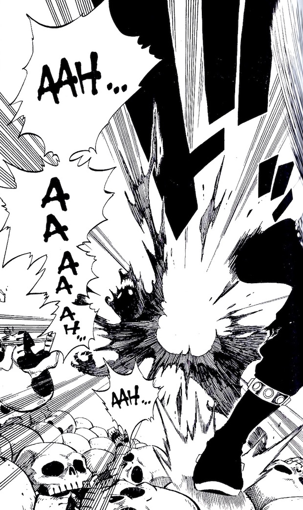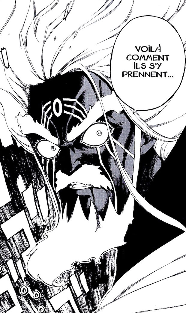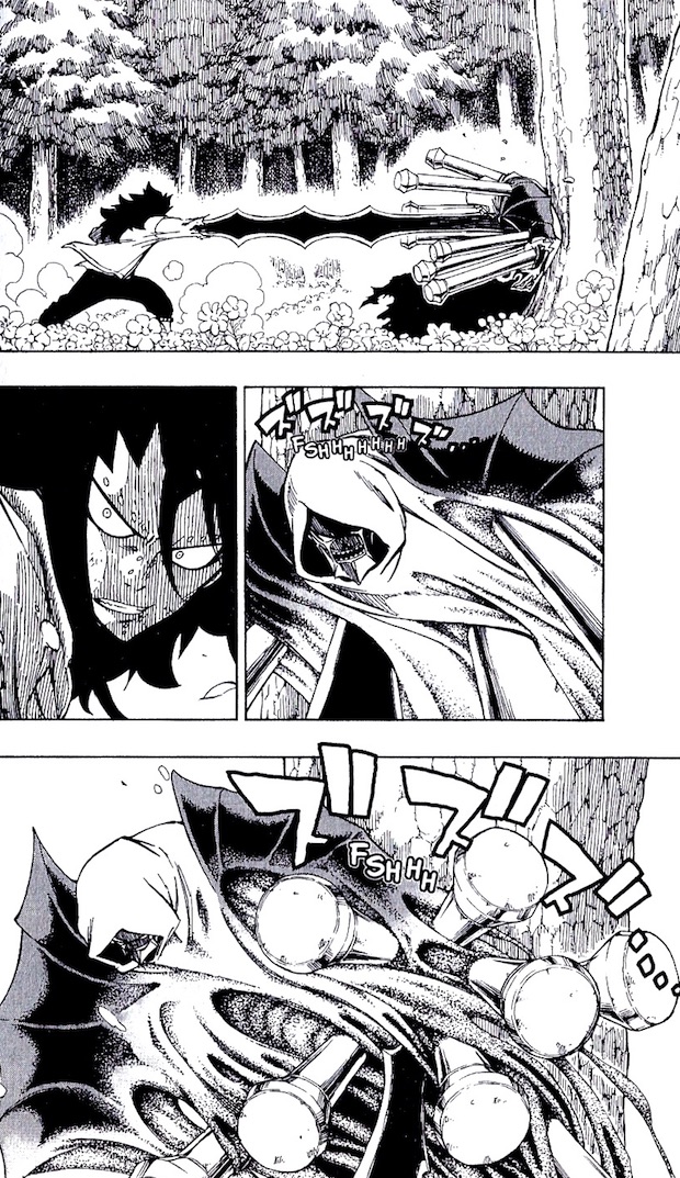 Ha, Simon ! Le seul drama de Fairy Tail xD Noyé dans un océan de niaiserie et de bons sentiments ! Et le fait que nous soyons parvenus à l’arc final ne change en rien ce constat mielleux. Les gentils remportent leurs combats contre les méchants grâce à la force de l’amour et de l’amitié. De manière très simpliste et dénué de rebondissements. Dans ces conditions, difficile d’apprécier la joute de l’un des mes personnages préférés du manga —> Gajeel Redfox ! Son combat contre Bloodman aurait pu être épique à plus d’un égard. Mais Mashima a préféré rester confiné dans sa paresse en nous léguant une écriture aussi mollassonne qu’hypocrite. S’il avait eu la même ligne d’esprit que dans Rave, son précédent manga, Gajeel Redfox serait mort héroïquement.