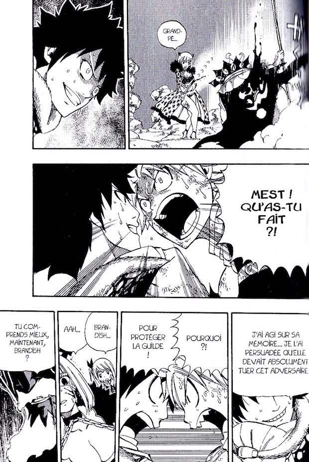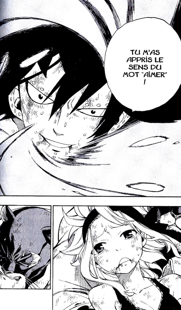 Mais revenons à Gajeel Redfox ! Au moins sa « mort » sert-elle de prétexte à avouer ses sentiments à Reby <3 C’est le seul fan service qui aura eu de l’effet sur moi ahah. Le reste —> Zéro ! J’ai par contre apprécié la trahison de Mest ! Lequel manipule Brandish afin qu’elle poignarde August <_< Mais ça ne se passe pas comme prévu et August manque de les atomiser (`0´)/ Hâte de le voir se fritter, le vieux ! Je me demande qui va être son adversaire (╹o╹) En croisant les doigts pour que ça ne soit pas Gildarts ! Il FAUT que le mage le plus puissant au monde ait sa revanche contre le dragon le plus puissant au monde, Acnologia (-‸ლ) Quant à Zeref, je me doute bien que ce sera Natsu qui s’occupera de lui régler son compte ._. Allez ! Vivement la fin !