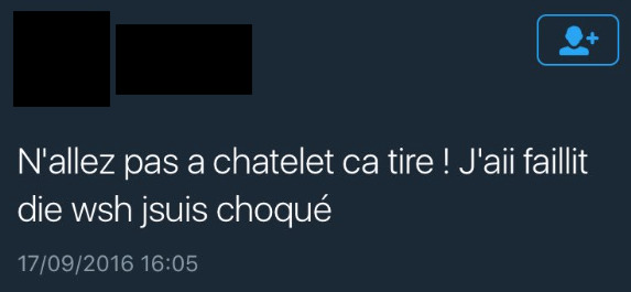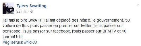 Se vantant d’être intraçables, la paire d’abrutis ne cesse depuis de se vanter sur Facebook et Twitter. Samedi dernier, une fausse alerte attentat déclenche une large opération antiterroriste sur Châtelet. C’est un appel à la police, supposément lancé depuis l’église Saint-Leu de la rue Saint-Denis (1er arrondissement de Paris), qui incite les autorités à boucler tout le quartier. Des habitants sont évacués, d’autres confinés à l’intérieur des commerces. C’est finalement la BRI (Brigade de Recherche et d’Intervention) qui, alors qu’elle vient d’arriver sur place, informe l’ensemble des services de renseignement qu’il s’agit d’une fausse alerte. Entre temps, des débuts de panique sont notés ci-et-là et Twitter s’enflamme avec de beaux mythomanes qui affirment avoir échappé à la mort en esquivant des balles et autres flèches d’indiens.