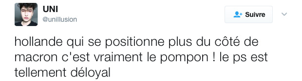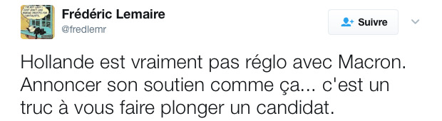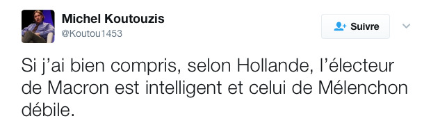 Et lorsqu’il est invité à préciser ses dires, Hollande fait ce qu’on attendait de lui —> La mise en avant d’un certain Emmanuel Macron. « Je considère que la politique a besoin de renouvellement et il (Macron) s’est lancé dans un pari pour le moins audacieux […] De la raison et du fond ». Damn ! Autant appeler à voter Macron dès le 1er tour au lieu d’être hypocrite à ce point ._. Pauvre Hamon <_< Il se sera décidément fait lâcher par tout le monde xD Ce qui n’est pas surprenant en soi vu que son programme social-démocrate est en opposition avec la vision sociale-libérale de Hollande/Valls/Macron. Une raison de plus pour se rallier à Mélenchon qui, lui, propose des mesures sociales-démocrates ! Qui plus est, Hamon est en pleine perte de vitesse dans les intentions de vote. Et vu que toute une aile de son parti l’a lâché, peut-être est-il temps d’oser et rabattre les cartes.