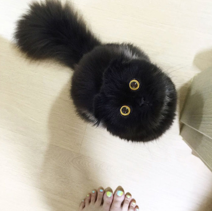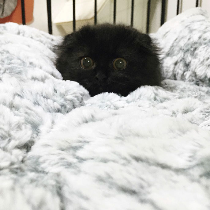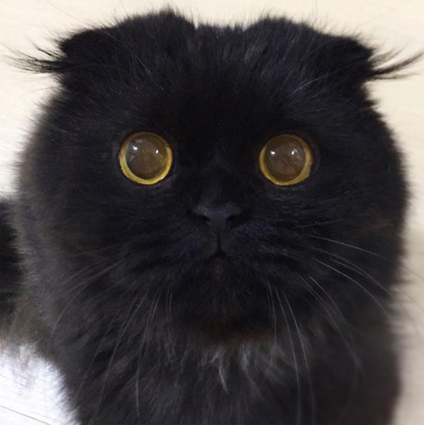 Boo le chien aurait-il enfin trouvé son pendant félin ? Il faut bien le croire _< Comment ai-je fait pour ne pas tomber sur cette adorable boule de poils plus tôt ? C’est impardonnable !!! Enfin… Pour celles et ceux qui seraient intéressés par la race de chat à laquelle appartient Gimo, il s’agit d’un Scottish Fold. Parfois appelé Highland Fold ! Originaires d’écosse, ces chats ont pour principale caractéristique d’avoir les oreilles toutes repliées vers l’avant. Ce qui donne l’impression d’avoir affaire à un grosse boule de poils surmontée de gros yeux tout ronds ! Hey ! Ce n’est pas un hasard si Gumo est souvent comparé aux Susuwatari du Voyage de Chihiro et de Mon Voisin Totoro \^o^/