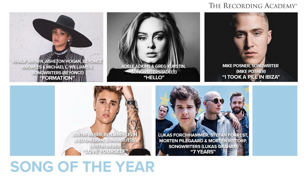 Dont le Grammy Award de la Chanson de l’Année pour Formation et celui de l’Album de l’Année pour Lemonade !  Et précisons que Beyoncé est également l’article la plus récompensée aux Grammy’s avec pas moins de 20 récompense (dont 3 avec les Destiny’s Child) ! Pour autant, la concurrence sera au rendez-vous avec une certaine Adele qui compte bien avoir sa revanche sur la précédente édition ! Rappelons que sa performance avait été entachée par un problème de micro u_u La pauvre avait pleuré toute la journée xD Il est temps de se rattraper (-‸ლ) D’ailleurs, Adele a beau n’avoir « que » 5 nominations, deux d’entre elle sont parmi les plus prestigieuses avec La chanson de l’Année pour Hello et L’Album de L’Année pour 25 ! De même —> Gare à l’embuscade du Bieber qui pourrait créer la surprise avec son album Purpose et la chanson « Love Yourself » écrit par un certain Ed Sheeran…