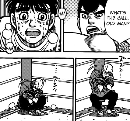 Youhouuuuuuu ^o^ Ippo is Back !!! J’étais tellement ému quand Takamura part soulever Ippo et que le coach lui répond qu’il a passé le test T_T Et les poids semblent avoir eu un effet décisif sur la capacité de Ippo à se balancer, esquiver et frapper de n’importe quelle position ! Encore quelques peaufinages et nous devrions avoir une machine de guerre (-‸ლ) Pour peu que Makunouchi déverrouille cet obstacle mental qui n’a de cesse de l’handicaper >__< Et si Takamura  n’est pas parvenu à le faire sauter, quel boxeur y parviendra ? Probablement Miyata… Depuis son sparring contre Nagumo, Ichiro semble particulièrement songeur ! Je suis persuadé qu’il a réalisé que quelque chose n’allait pas chez Ippo ! Il va falloir que ces deux-là se rencontrent et nous fassent un petit sparring !!