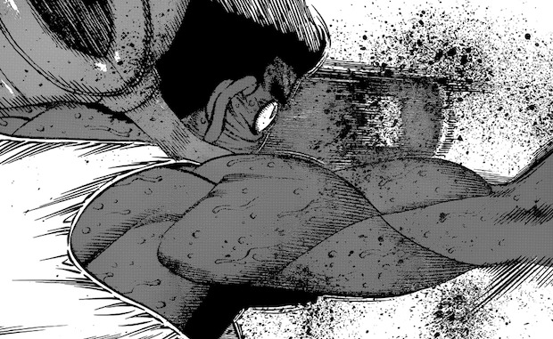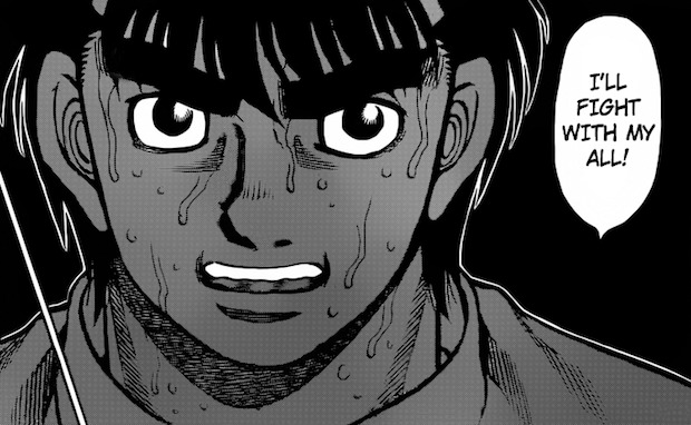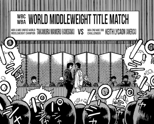 Moooo ! Le tampon de Kamogawa est trop mignon <3 Un petit canard (Kamo) sur une rivière (Gawa) ^o^ Ça me fait encore plus apprécier le coach huhuhu ! Anyway ! Cette accélération de rythme avec la pesée de poids pour le titre de défense de Taka est très appréciable ! Je me demande ce que vaut son adversaire, Keith Lycaon… Un américain placé 2e en WBA et 3e en WBC ! Rappelons que Taka est le champion WBA/WBC depuis sa victoire sublime contre Richard Bison <3 À cet égard, je me rappellerai toujours de sa très faible introduction par Morikawa ! À l’époque, tout le monde pensait que le match serait plié en deux rounds —> Grave erreur u_u Takamura a dû lutter pour l’emporter au 6e round ! Il faut dire que son problème de jambe gauche n’a pas aidé u_u Quoiqu’il en soit, ce Keith doit être sacrément sûr de lui pour affronter un tel monstre !
