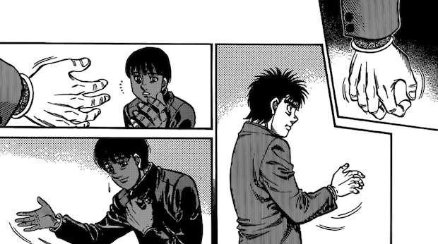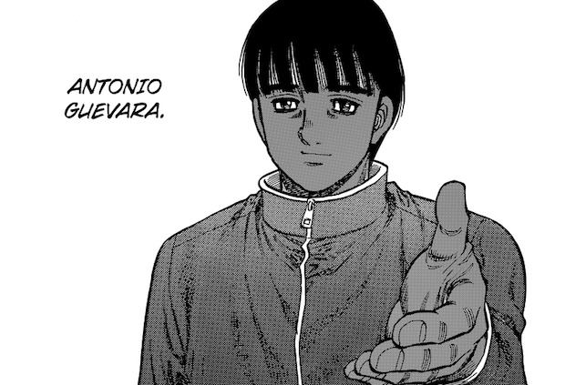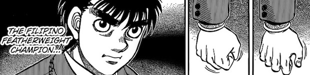 Ha, Takamura ! Dès qu’il prend la pose avec un adversaire, on se demande si ça ne va pas partir en vrille xD Et son adversaire s’appelle Keith Lycaon (US) ! 2nd WBA et 3e WBC en catégorie Poids Moyens. Je me demande ce qu’il vaut… J’espère que le combat ne trainera pas trop ! Quand bien même Keith doit être un minimum sûr de lui vu qu’il challenge Takamura -_-‘ Quant à Ippo, je suis déjà plus tracassé ! Son adversaire, le champion philippin Antonio Guevara, semble fort ! Surtout —> On voit que son passé a été difficile (enfance dans les bidonvilles) et qu’il a traversé l’enfer. Il ne fait aucun doute qu’il se battra avec toute la volonté du monde ! Et Ippo a intérêt à lui faire comprendre de suite qu’une victoire n’est pas à l’ordre du jour ! D’ailleurs, parlons un peu de CE moment…