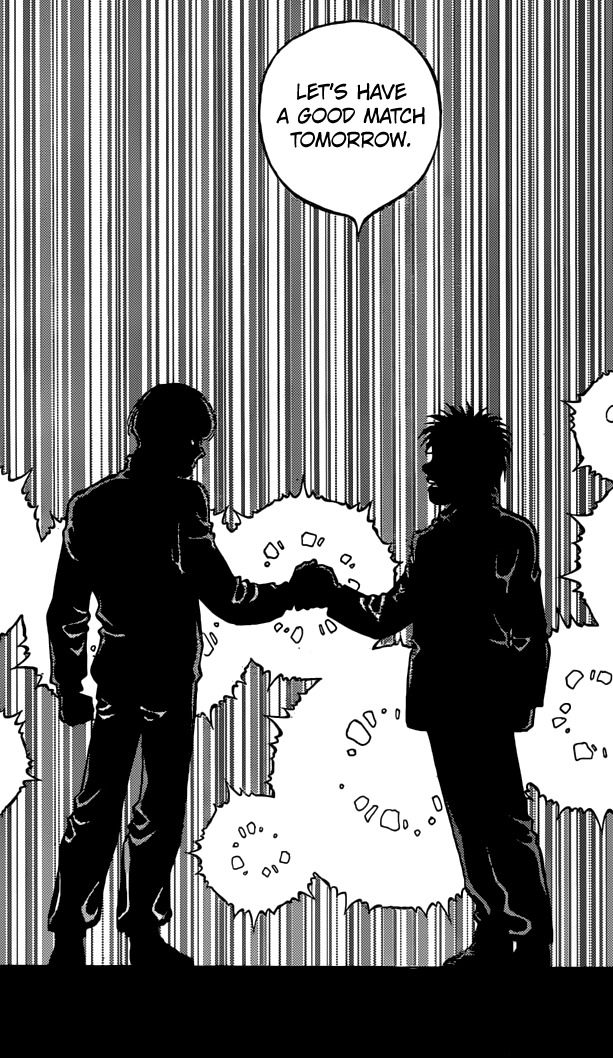 Soit lorsque Ippo refuse de serrer la main gauche de son adversaire et l’oblige à utiliser sa main droite. C’était…embarrassant ? Surtout de la part de Ippo ! Mine de rien, ça montre un changement de mentalité. Auparavant, je suis certain que Makunouchi aurait accepté la première poignée de main d’Antonio ! C’est dans sa nature et Ippo n’aime pas les conflits inutiles. Or, ici, notre héros s’est déjà mis dans le combat et refuse de céder. Damn ! Allez, mes prédictions —> Takamura l’emportera contre Keith Lycaon dès le premier round ! Et…idem pour Ippo ! J’ai vraiment envie qu’il marque son retour de la même manière que lors de son match post-défaite contre Eiji Date ! Ha ! Ça faisait longtemps que je n’avais pas autant attendu de chapitre HnI *_* Allez Taka ! Allez Ippoooo (`0´)/