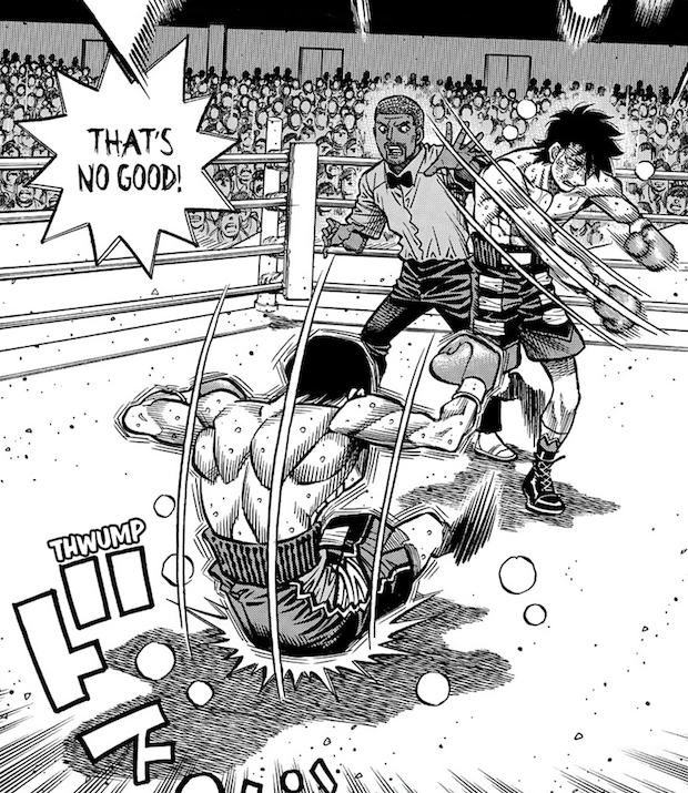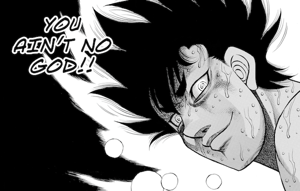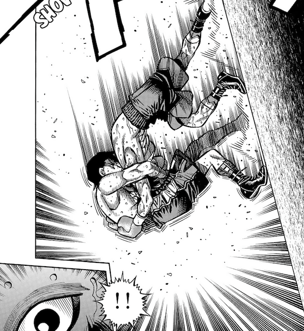 Sans omettre le risque d’un troisième match Ippo vs Sendo sachant que Takeshi a déjà perdu deux fois et que Ippo reviendrait de sa retraite. Ça ne fait « pas sens » d’un point de vue scénaristique. Mais seul Morikawa sait où se dirige son oeuvre et lui-même a admis avoir changé d’avis en plein milieu d’un match. Pour la simple et bonne raison qu’il se plonge totalement dans les psychés de ses personnages. Un peu à la manière de Togashi-san (Hunter X Hunter). Sur ce, croisons les doigts pour que le clinch aboutisse au down. Il est plus que temps de renverser la vapeur et de montrer à Ricardo que même lui peut avoir peur pour sa vie. « Tu n’es pas un dieu ! ». Quel planche incroyable ! Une des meilleures de tout le manga ! La droite qu’il envoie suivi d’un smash me fait dire qu’il s’agit d’une excellente combinaison (et qu’elle n’est pas terminée).