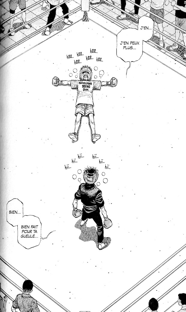 Pour l’heure, il s’agit de permettre à Mashiba de devenir champion du monde ! Ce qui serait une consécration pour lui qui est parti de si bas. Une chose est sûre, Ryo est en capacité de l’emporter. Même avec un combattant fausse patte, sa tactique de riposte est parfaite. À savoir avancer sa jambe avant, changer son axe pour être moins de coté et, se faisant, rapprocher son poing droit de l’adversaire. Le tout en combinant les feintes. Ha, voir Mashiba et Makunouchi se bagarrer en fin de combat comme des beaux frères. Que c’est beau ! Allez, Ryo ! On croit en toi ! Deviens le premier boxeur de la génération Hajime à emporter une ceinture mondiale ! Aja aja fighting !!!