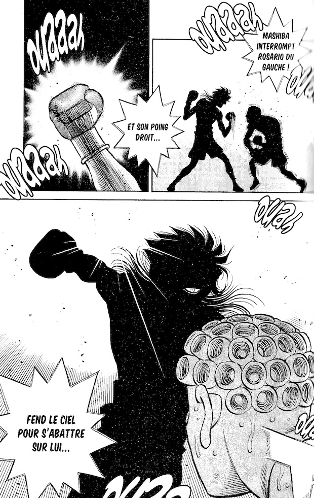 Quel tome chargé de tension ! Déjà, Mashiba est au top de sa forme et ça fait plaisir à voir. Que ce soit sur le plan physique ou mental, il accomplit pour l’heure un sans faute. Parant les coups de Rosario quand il le faut et attaquant dès qu’une opportunité se crée. Et pourtant, malgré le manque de préparation et l’immaturité de son adversaire, force est de constater qu’il reste un champion. Il a suffit d’une minuscule fenêtre pour Rosario et, bam, Mashiba était à terre. S’il n’était pas parvenu à retourner la situation en infligeant derechef un down à Rosario, qui sait ce qu’il se serait passé.