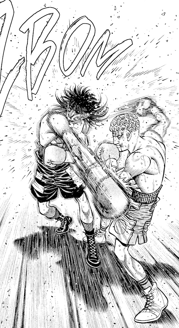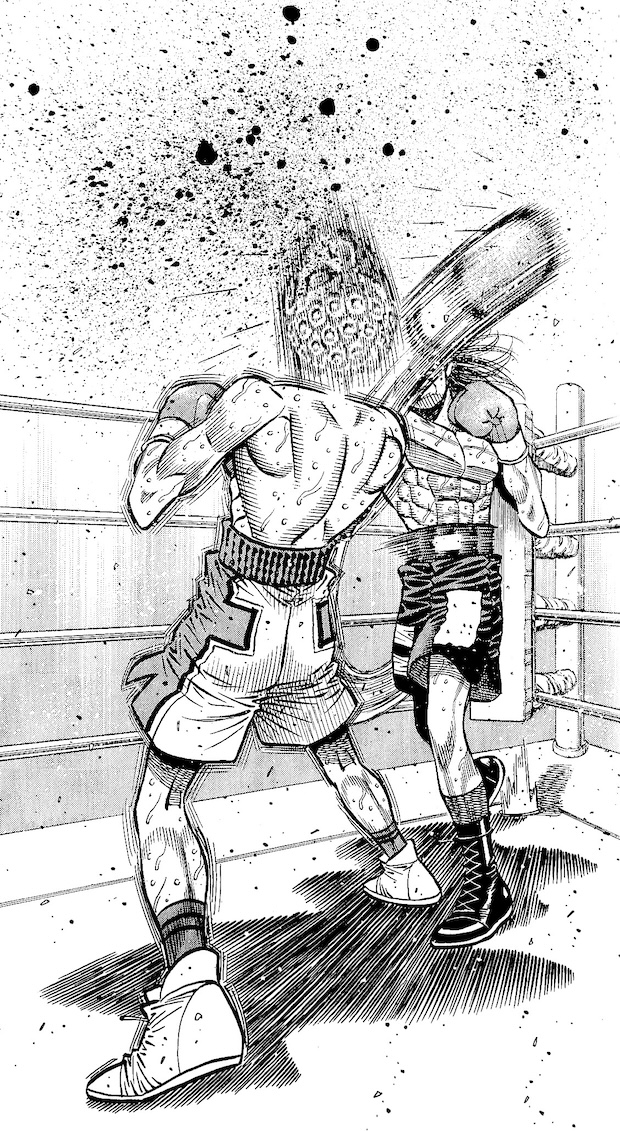 « Il lui a foncé dessus ?! » s’exclame l’arbitre alors que Marcus Rosario vient d’accélérer subitement sur Mashiba au début du deuxième round. « Comme prévu… » se dit le coach de Ryu, Toho. « Il passe à la vitesse supérieure ». « En bloquant la jambe avant de Mashiba par l’extérieur quand il attaque… » observe Miyata. « Il sécurise sa position en une fraction de seconde ». Ce qui lui permet d’armer une grosse frappe du gauche. Mais Mashiba sait comment s’adapter. « Il a changé l’écartement de ses jambes ? » réalise Ichiro. De cette façon, et grâce à son allonge exceptionnelle, Rosario est trop loin pour l’atteindre. « Je comprends pas… » peine à réaliser de son coté le coach de Rosario. « Il n’y a aucun gaucher aussi fort ! Il n’a pas pu trouver de partenaires de sparring à ce niveau… À moins que… ». À moins que, oui, tout cela ne soit du déjà vu pour lui. « Tant que je fais taire mon démon… » se rappelle Mashiba dans un coin de sa tête. « Tout ira bien ».