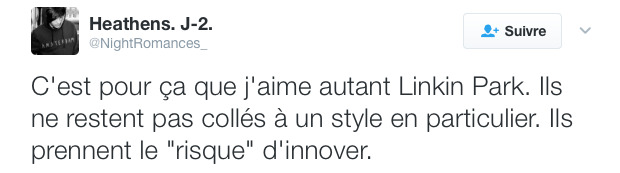 Anyway ! Pour revenir à Heavy ! Le seul reproche que je ferais au morceau est qu’il est un peu trop mainstream ! Autrement, la rythmique est catchy et se marrie bien à la voix de Mike ! Désormais, il va falloir que Linkin passe la seconde s’ils comptent renouveler le phénomène Meteora ! Numb, Breaking the Habit… Qui ne s’est pas déchainé sur ces deux chansons en 2003 ? <3 C’était l’époque où les groupes de rock étaient tendance as f*ck ! Blink-182, Green Day, Sum 41, The Offspring… Une époque révolue ! Aujourd’hui, la Pop, le RnB, l’Electro et le Rap/Hip-Hop sont devenus les nouveaux Eldorado de la scène musicale ! Et peut-être est-ce pour s’inscrire dans cette tendance que Linkin Park a opéré un tel virage… Réponse le 19 mai 2017 avec la sortie du 7e album, One More Light !