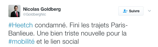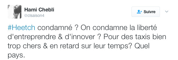 À priori, Heetch empièterait sur les plates-bandes des taxis avec une concurrence « illégale » du fait de tarifs beaucoup plus avantageux .Sauf que j’ai du mal à voir où est la concurrence vu qu’il s’agit de covoiturage et que les conducteurs, du moins en principe, partagent leurs frais de véhicule et ne sont pas des salariés réguliers avec un chiffre d’affaire régulier. Bref, je ne comprends pas cette condamnation >_< L’idée semble bonne, ça désenclave les banlieues en créant du tissu urbain et les jeunes peuvent rentrer chez eux sans avoir à payer une fortune en faisant appel à un taxi. Sachant que ce dernier peut tout à fait refuser d'aller en banlieue xD Ajoutez à cela le fait que la clientèle de Heetch ne prend presque jamais de taxi en temps normal + le fait que les conducteurs soient limités à deux nuits par semaines et que le prix soit fixé par le client... Voilà, quoi ! Autant interdire le covoiturage urbain à ce compte-là…