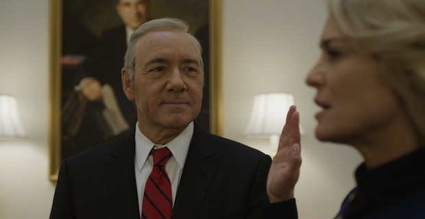 Damn ! Claire Underwood en Présidente des États-Unis d’Amérique *_* Vive le 12e amendement \^o^/ Et comme on pouvait s’y attendre, le goût du pouvoir lui donne envie d’y rester ! Quitte à aller contre la volonté de son mari… Pendant ce temps, Maccalan met ses menaces en pratique et commence à diffuser des fuites ! Comme quoi l’explosion d’un commerce il y a quelques semaines pourrait avoir été orchestrée par le gouvernement. « Retire les chiens du FBI ou je fuite des éléments encore plus compromettants ». Etttt il vient de se faire molester par Patrov (président de la Russie) xD Du coté de Seth, celui-ci continue à enquêter sur le lien entre Doug, Lisa Williams et Rachel Posner qui a disparu. Son instinct ne le trompant que rarement. Et quelque chose lui dit que son nemesis a quelque chose à se reprocher. Quelque chose d’extrêmement grave. Étrange que Hammershmidt ne l’ait pas saisi en plus de virer Sean Jeffries ! Alors qu’il était sur un bon lead !! […] Ouf ! Tom vient de faire un lien tangible grâce aux travaux de la pauvre Zoe Barnes. Tuée par Frank Underwood parce qu’elle commençait à trop fouiner eu égard au meurtre du député Peter Russo…