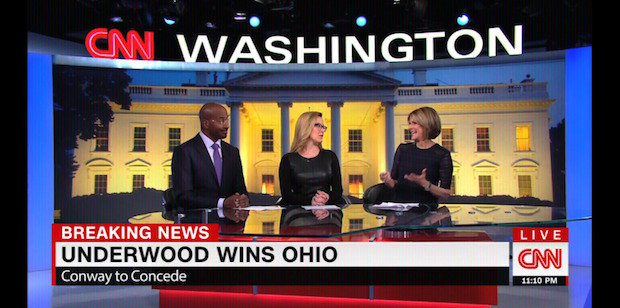 Ça y est —> Frank Underwood a remporté l’Ohio et se faisant l’élection présidentielle. Tout s’est fait en deux étapes. D’abord la diffusion de la première cassette audio montrant aux Américains le visage névrosé et impulsif de Will Conway. Ensuite la deuxième cassette audio prouvant que le Général Brockhart entendait tuer Frank si celui-ci lui donnait des ordres contraires à son « éthique ». Cela même au moment où Brockhart tenta de venir au secours de Conway. Ils n’avaient aucune chance. La Machine Underwood est impitoyable et l’a à nouveau prouvé aujourd’hui. […] « Vous n’avez pas à prononcer les mots, Gouverneur » tente de le rassurer Frank. Au bout du fil, Will Conway. « Non, je dois le dire, Félicitations M. Le Président ». Le Pays en premier. Toujours.