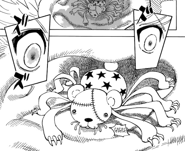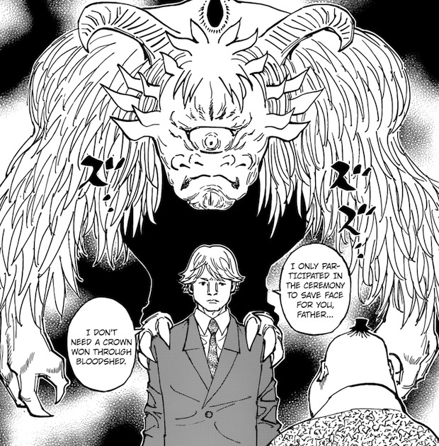 Si Sairid s’est fait avoir, c’est parce qu’il a fini par répondre « Oui, je suis libre » à l’une des bestioles. Or, il s’agissait de la condition à remplir (« Je suis libre ») pour se faire posséder… Notez que ces bêtes parasitaires sont liées aux 14 Princes et Princesses de Kakin mais que ceux-ci n’ont aucun contrôle sur eux ! Tant que nous ne réalisons pas leurs conditions, nous ne sommes pas sous leur contrôle. Autrement, il faudrait être capturé vivant comme pour Sairid et se faire pomper son nen jusqu’à ce que la bestiole prenne la poudre d’escampette ! Reste à savoir de quel prince ou de quelle princesse viennent ces créatures ! De la Princesse Momoze ? Celle-ci a l’air de jouer un double jeu… Et l’un des plus importants prétendants au trône de Kakin, Halkenburg, vient de se retirer de la bataille de succession !! À dessein ou par contrainte ? Wait & see…