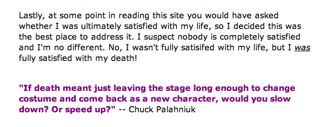 « L’objectif de cette démarche est que si je n’avais pas eu un frère et une soeur, mon existence aurait été très vite oubliée à moins que je fasse quelque chose en dehors du commun » : ce quelque chose, Martin Manley l’a fait en se suicidant juste après avoir crée ce site. « J’ai décidé d’avoir l’un des adieux les plus organisés de l’histoire, et je pense que ce sera une réussite ». Et il n’y a qu’à jeter un oeil au site en question pour être abasourdi de son contenu.
