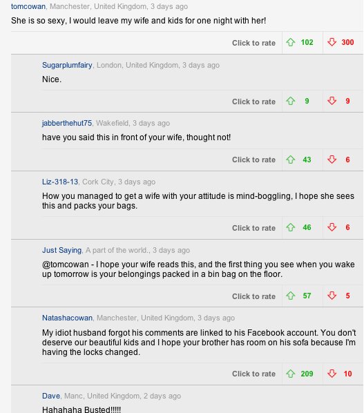 « Elle est tellement sexy que je quitterai ma femme et mes gosses juste pour une nuit avec elle » : c’est le commentaire qu’a laissé Tom Cowan sur un site vis-à-vis d’une photo de la belle Kerry Brook. Seulement voilà, Monsieur avait oublié que ses posts étaient liés à son compte Facebook et que, donc, tout le monde pouvait les consulter. Sa femme y compris.